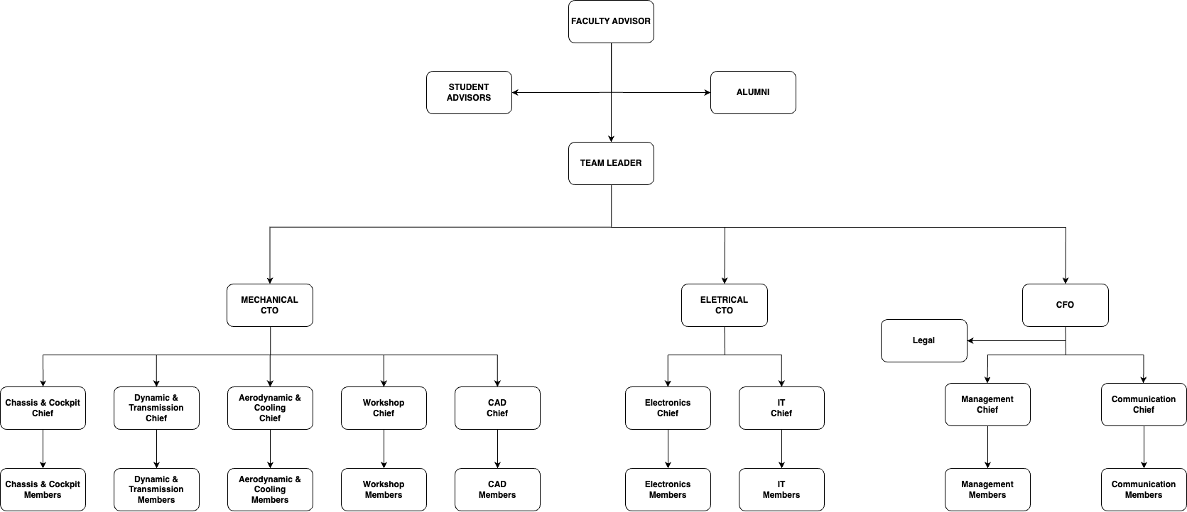 All’apice c’è il Faculty Advisor, il punto di riferimento di tutto il Team e, fin dalla fondazione del progetto, tale ruolo è stato ricoperto dal Professore Maurizio Muzzupappa. Gli Students Advisor, invece, sono ex membri che rappresentano una guida per il Team e fungono da intermediari tra Team Leader e Faculty Advisor. Il Team Leader, nominato annualmente dal Faculty Advisor, si occupa della gestione del Team e delle attività di lavoro.
